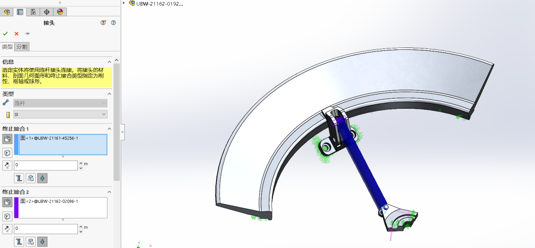 新的虛拟連杆連接器可(kě)以用圓柱面或頂點來(lái)代表連杆的兩端,端部條件(jiàn)可(kě)以被定義爲完全剛性的、旋轉型及球形鉸鏈。我們将選擇圓柱形面和球形端部條件(jiàn)來(lái)正确模拟拉杆的功能,我們甚至可(kě)以從(cóng)幾個截面形狀中選擇并定義截面尺寸。