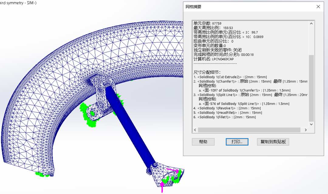 用戶在劃分(fēn)網格之後也可(kě)以通過新的摘要功能詳細查看(kàn)每個零部件(jiàn)的網格劃分(fēn)尺寸及網格控制添加情況。