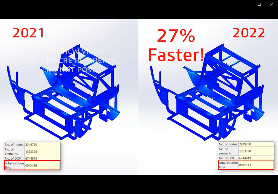 很多大(dà)型裝配體(tǐ)中包含大(dà)量的粘合觸點,現在這種類型的裝配體(tǐ)的求解速度比2021版本快(kuài)25%以上。